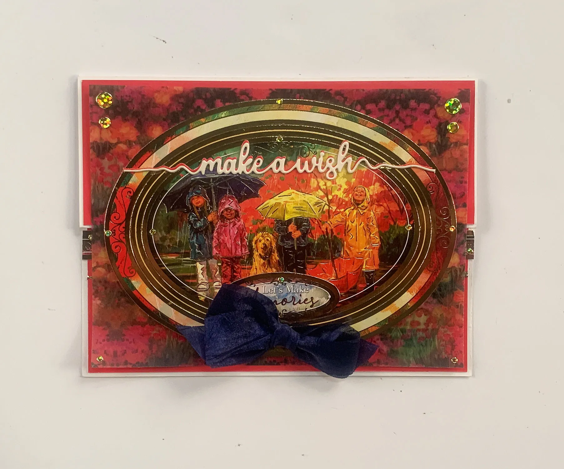 Die cut the “Make a wish” die in white and red Adorable Scorable. Glue the white on top slightly off so it stands out. Glue along the top of the ovals as shown. Glue “Let’s Make Memories” die-cut at the bottom and Zot™ a 2 1/2” blue bow as shown. Place gold Jewel Dazzles™ stickers in the corners.