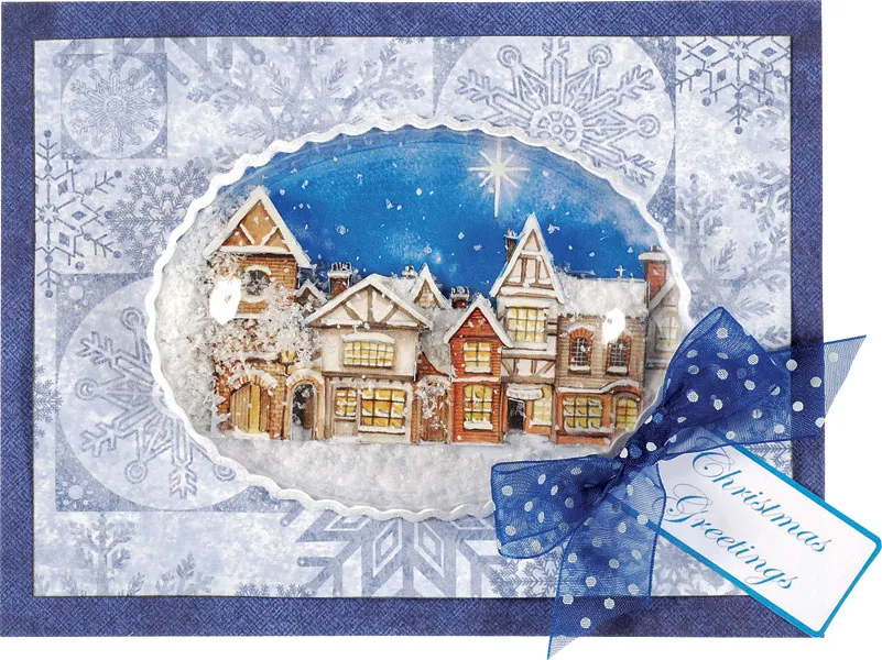 Place the card with the fold at the top. Cover the card with dark blue paper and Use the oval window template from the kit to trace the window onto the back of the light blue snowflake paper. Cut out the rectangle with oval window and glue to the card front with the dome placed in the paper window.