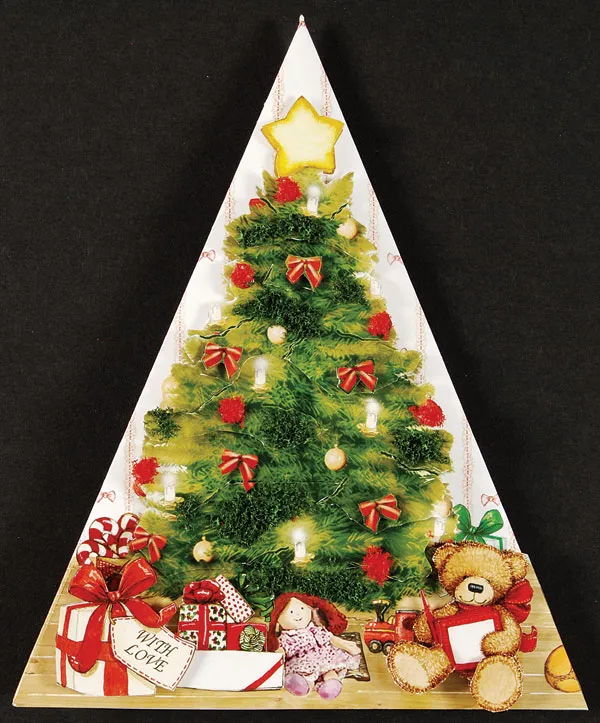 Cut out and fold the pyramid tree. Glue the greeting to the inside back of the pyramid. Follow the order of layering the branches with their corresponding numbers. Avoid using foam tape along the top edges of the layers as the tape will get in the way of tucking layers behind one another.