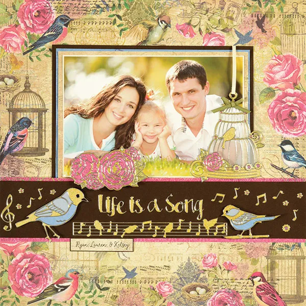 Use Song Birds ivory/pink/blue roses/birds border paper for your backgrounds. Back Dazzles™ birdcages and parts of the birds with vellum. Then back each bird with light blue textured paper, except for the eyes. Back the roses on pink paper and the leaves on green paper.