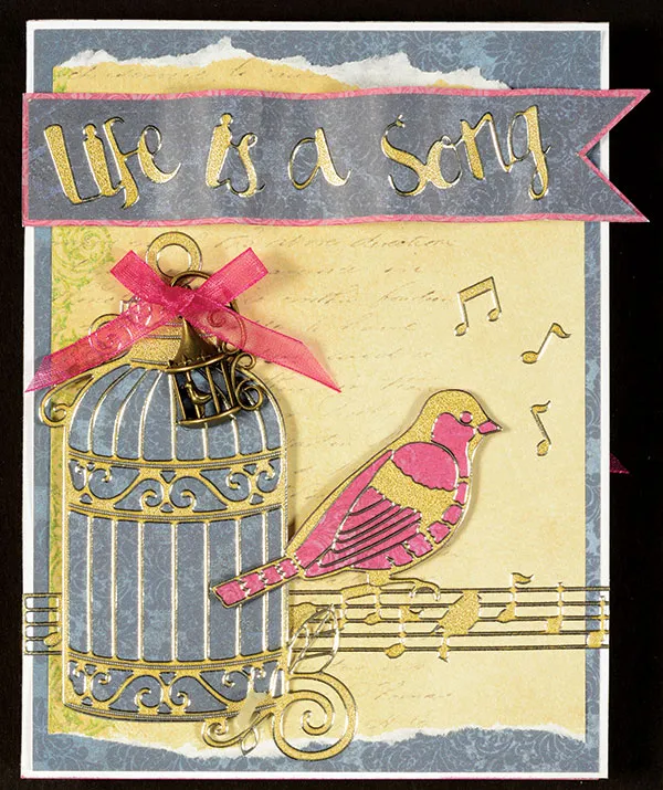 Back the large birdcage on blue paper, and the large right facing bird on pink paper, and foam tape in place. Add music note Dazzles™. Zot™ on a charm and a bow.