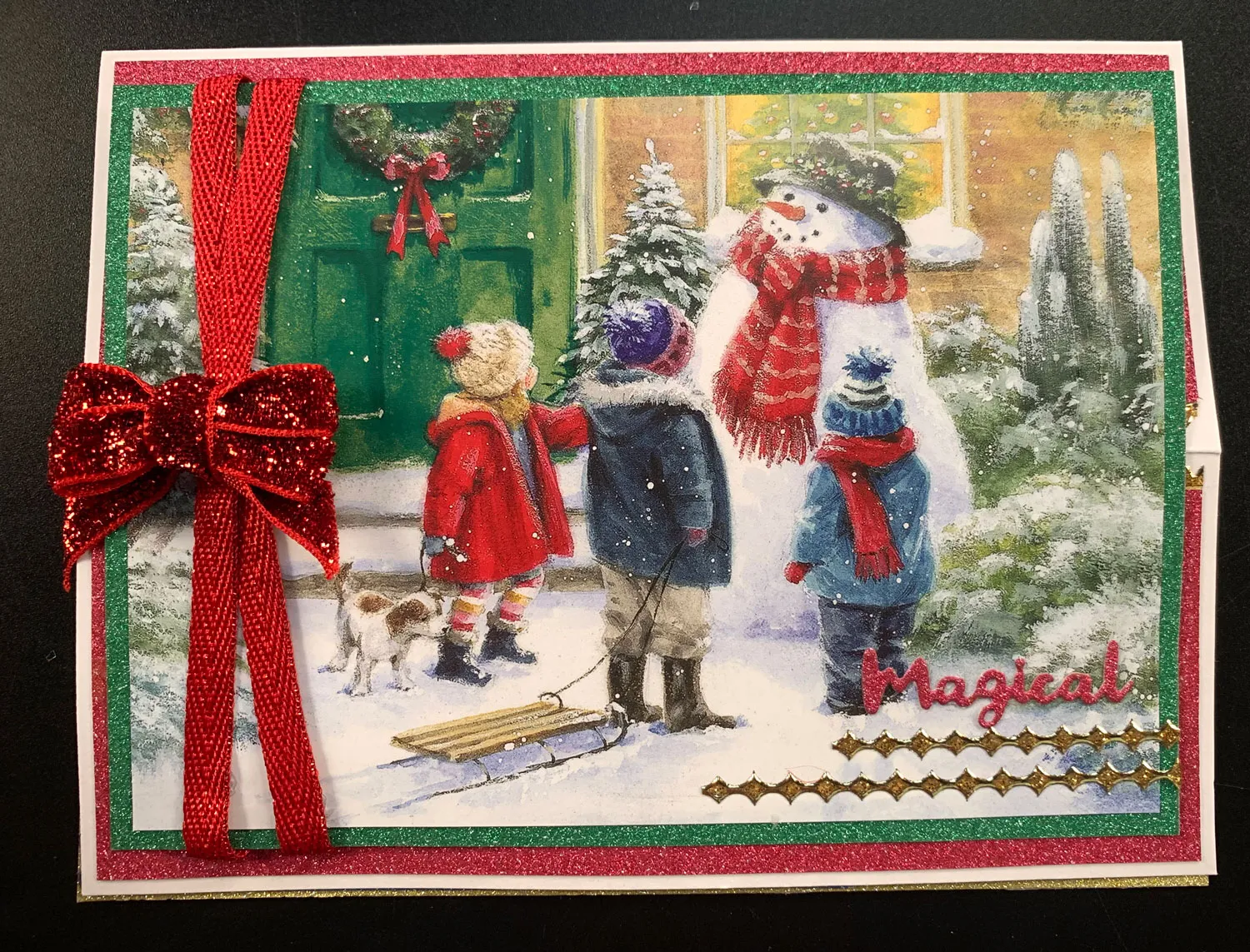 Place a blank card with the fold at the top. Fold the front in half to form an easel. Cut two 6 1/4”x2 1/4” of Ruby Red Cardstock and glue one to each top section. Place a Gold Border Dazzles™ along each inner edge. Mat the sheet from Little Book of A Magical Christmas Time on Green Cardstock with 1/8” borders. Zot a Red ribbon over the left at a diagonal and wrap around again so it crosses. Glue a bow where they meet. Die cut the word Magical out of the Red Shimmer Cardstock and glue ONLY the bottom edge to the front bottom panel. Place two strips of gold Dazzles™ as shown.