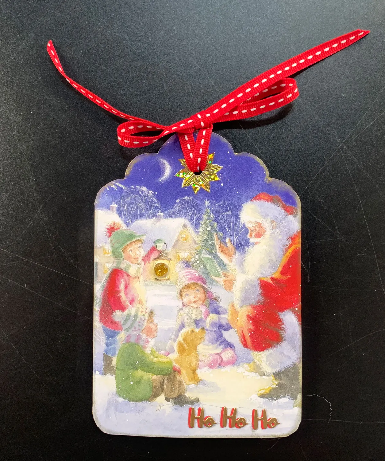Cover front with vertical image from a Little Book of A Magical Christmas and trim to fit. Run the gold ink pad along the edges. Die cut three gold and three red “Ho” dies. Glue together and to the card using Sticky Specs. Place gold Poinsettia Dazzles™ from Never Before Seen Dazzles™ in the center of both the front and inside for the ribbon.