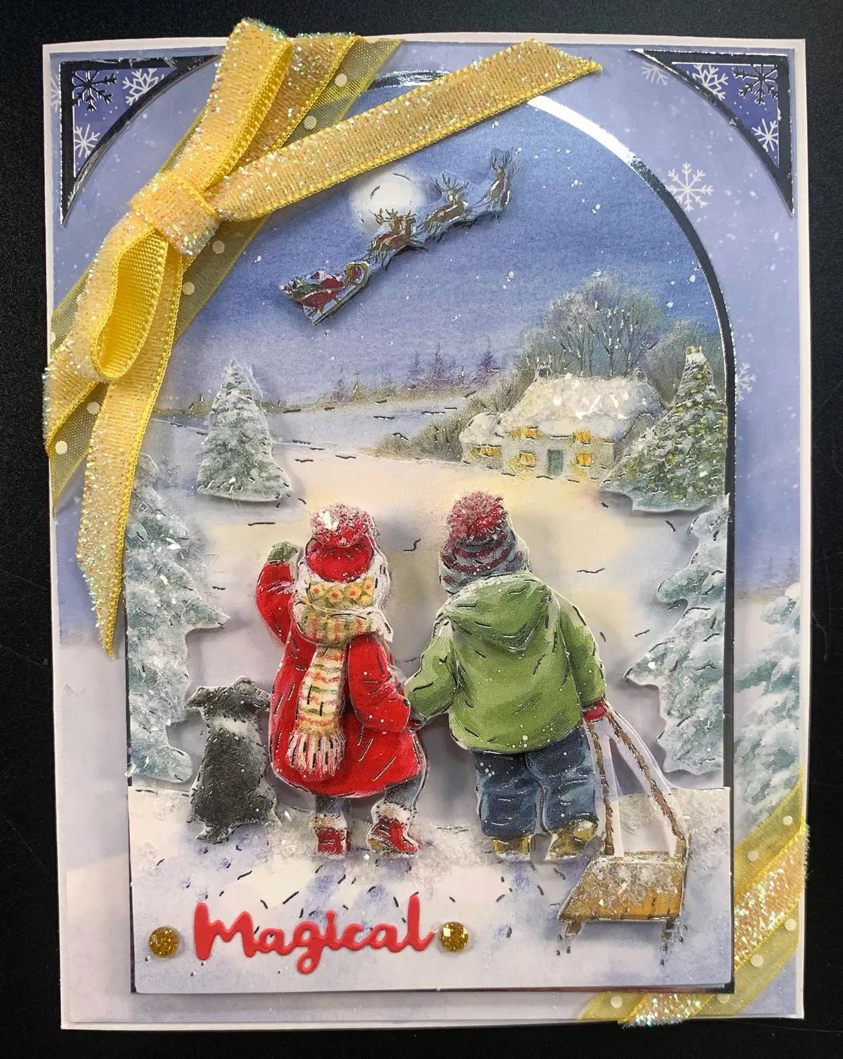 Create the layered focal using foam tape with the arch die-cut and individual matching pieces. Cut the corresponding Adorable Scorable to 4 7/8”x6 3/8”. Layer two of the Yellow ribbons together as shown and wrap around two corners then glue behind the cardstock. Zot™ a 2” bow as shown. Glue to the card front leaving a 1/16” white border. Glue corner die-cuts to the top corners. Die cut the word magical in red cardstock and glue as shown with Diamond Sparkles on either side. With a paintbrush glue over the snowy areas then cover in Diamond Dust, shake off the excess and let dry.