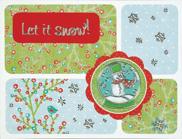 Place the card with the fold on top. Round the corners of a 4"x21⁄2" green dot and glue 1⁄8" from the top and left edges. Round a 4"x2" blue dot/tree border and glue 1⁄8" below the first paper. Round a 2"x21⁄2" blue dot and a 2"x2" green dot. Glue 1⁄8" right of the first papers as shown. Round a 3"x1" red paper and place “Let it snow!” Dazzles™. Glue on the top left.