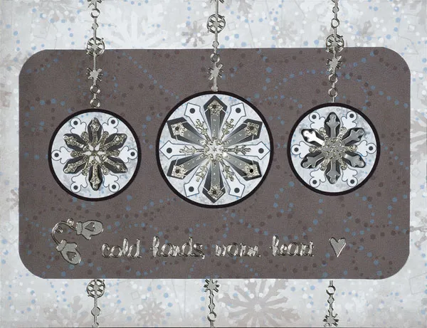 Glue the larger die cut centered, 1" from the top. Glue the smaller ones 1⁄4" on each side. Place border Dazzles™ above the die-cuts and place borders on the bottom below the dot paper. Trim the borders even with the card edges. Place “cold hands, warm heart Dazzles™ on the bottom of the dot paper and place mittens and a heart on either side.