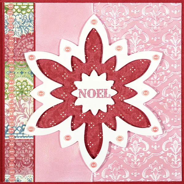 Punch out the smallest die cut and remove the nibs. Stamp “Noel” in the center, then foam tape to the maroon flower center. Close the card and mat it on cardstock with 1/16" borders.