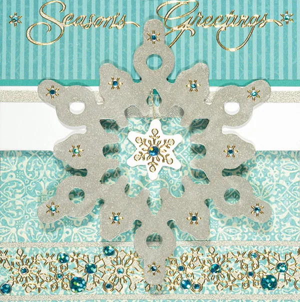 Punch out the largest snowflake die cut and remove the nibs. Cover it with Wink of Stella, let dry, then coat it again. Foam tape to the front, aligning the snowflake points. Place Dazzles™ snowflakes and jewels on the die cut and near the greeting as shown.