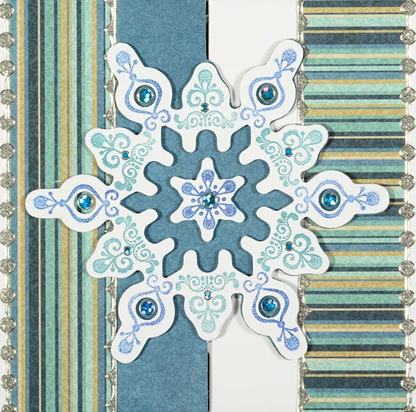 On the back, cut along the outer edges of the large snowflake and along the folded card edge. Cut 1¼"x4 5/8" Fresh Frost blue/teal striped paper and glue 1/8" from the front left edge. Cut two 4 5/8" Dazzles™ borders and place along the long edges of the strip.
