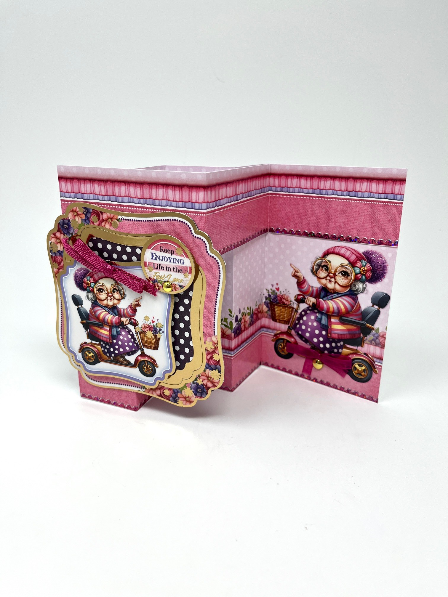 Remove center focal of the three-part Topper on Forever Fabulous sheet. Tape both frames to the large purple dotted paper from the Dotted Duos and cut around the edge. Tape them to the left section as shown. Foam tape the center lady on scooter to the lower left on the frames. Make and Zot™️ a 2” wide bow from the Magenta/Dark Pink Ribbon Set and place atop the lady. Foam Tape “Keep Enjoying Life in the Fast Lane” Topper in the top right corner and place a gold stud as shown. Make and Zot™️ a 2” wide bow from the Magenta/Dark Pink Ribbon Set and place below the scooter on the right and place a gold stud below it. Place pink border Dazzles™ anywhere the back of the card shows when the card is folded.