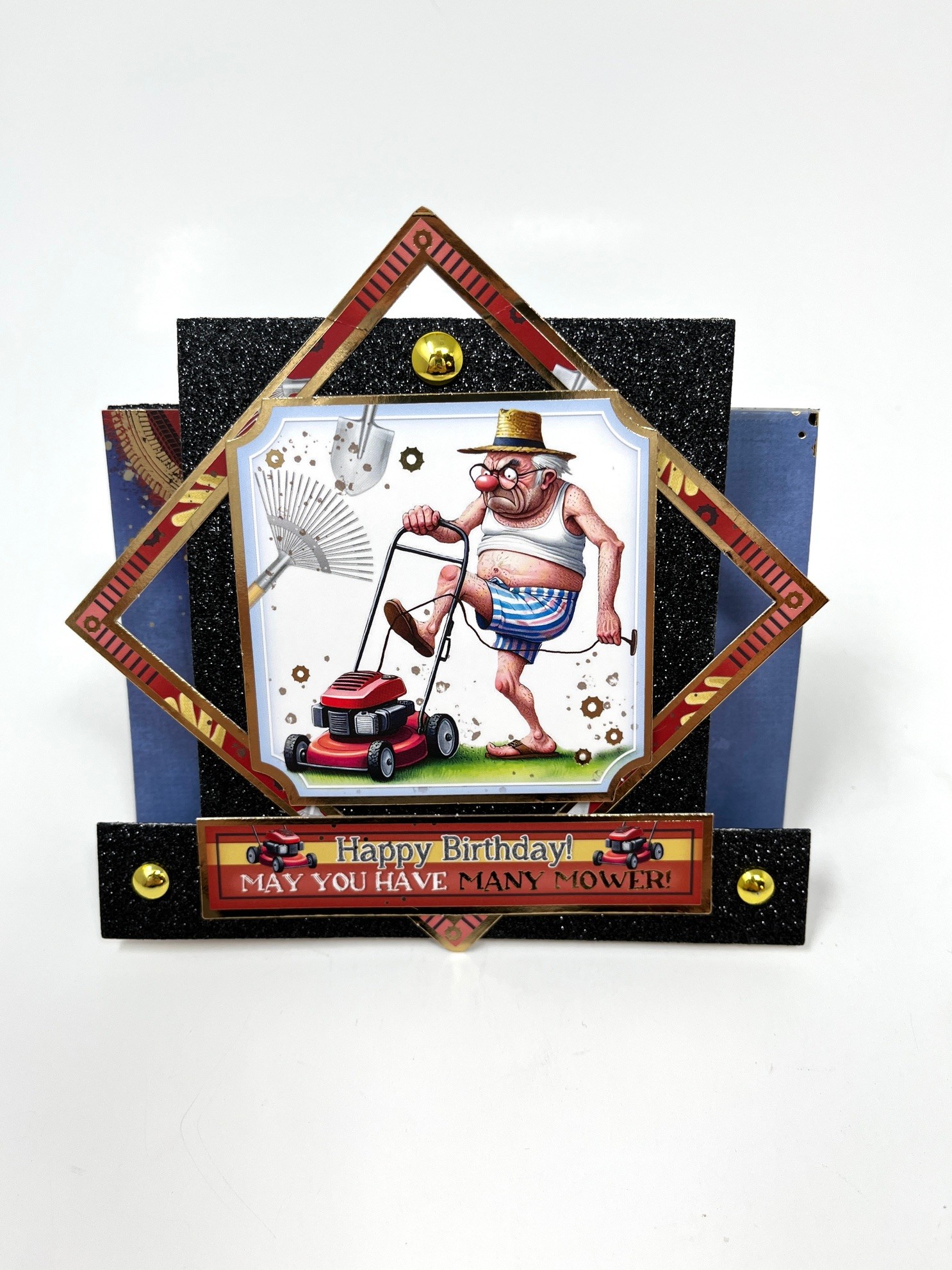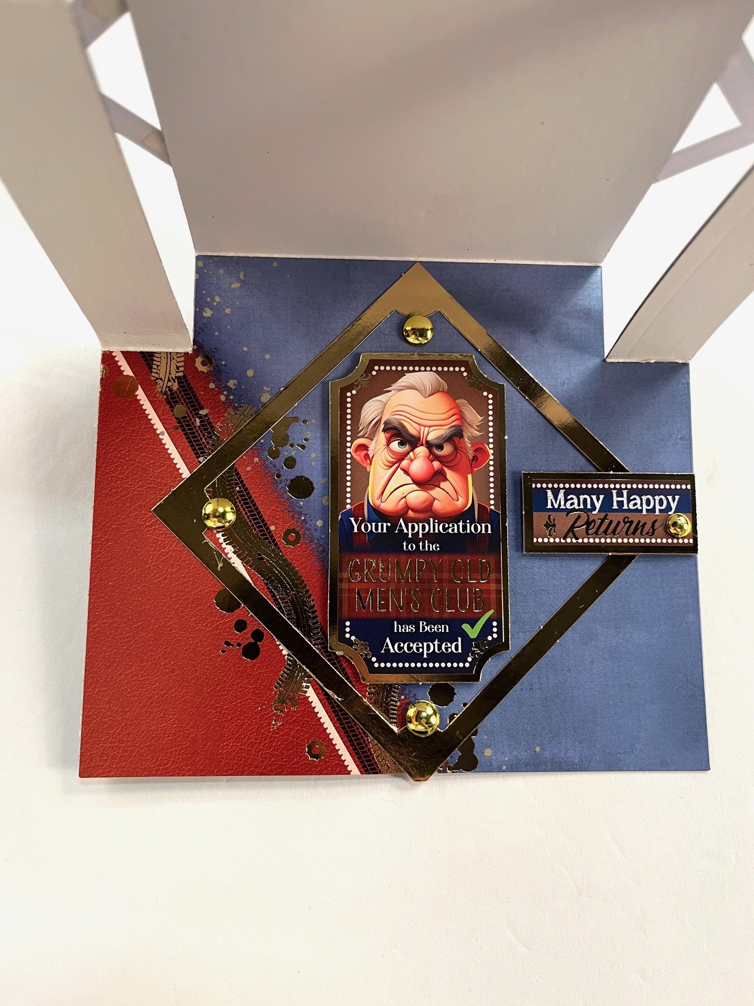 Card inside: Tape die cut Adorable Scoreable to the inside. Tape gold frame on point in the center. Foam Tape “Grumpy Old Men’s Club” in the center. Foam tape “Many Happy Returns” to the center right. Place studs as shown.