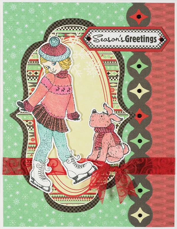 Cut out the colored images, leaving a 1/16" white border on each. Glue the dog just above the ribbon knot and foam tape the skater to the left, overlapping the ribbon. Place rhinestones as shown.