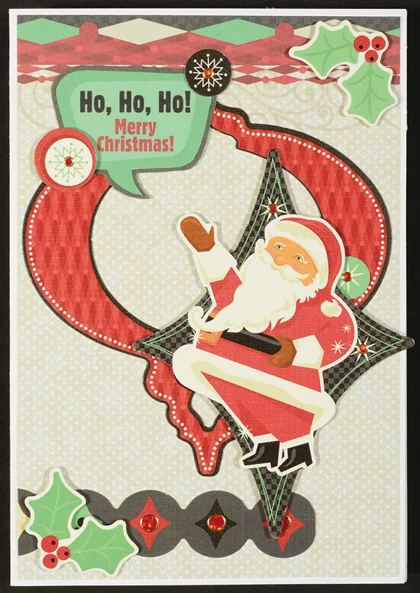 Punch out the die cuts shown and remove the nibs. Glue the holly to the sentiment at the lower right. Glue the large ornament hanging from the upper edge 3 5/8" from the top and 1/8" from the fold. Trim off the excess hanger.