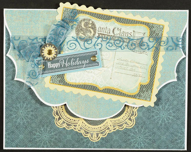 Punch out the Santa Claus postcard, leaving the center label intact, and glue to the flap front, angled as shown. Cut a 13" sheer ribbon and wrap it around the flap, overlapping and gluing the ends on the front 1½" from the left edge. Make a 4-loop bow with the remaining sheer ribbon and tie the center with thread. Glue the bow over the ends of the first ribbon.