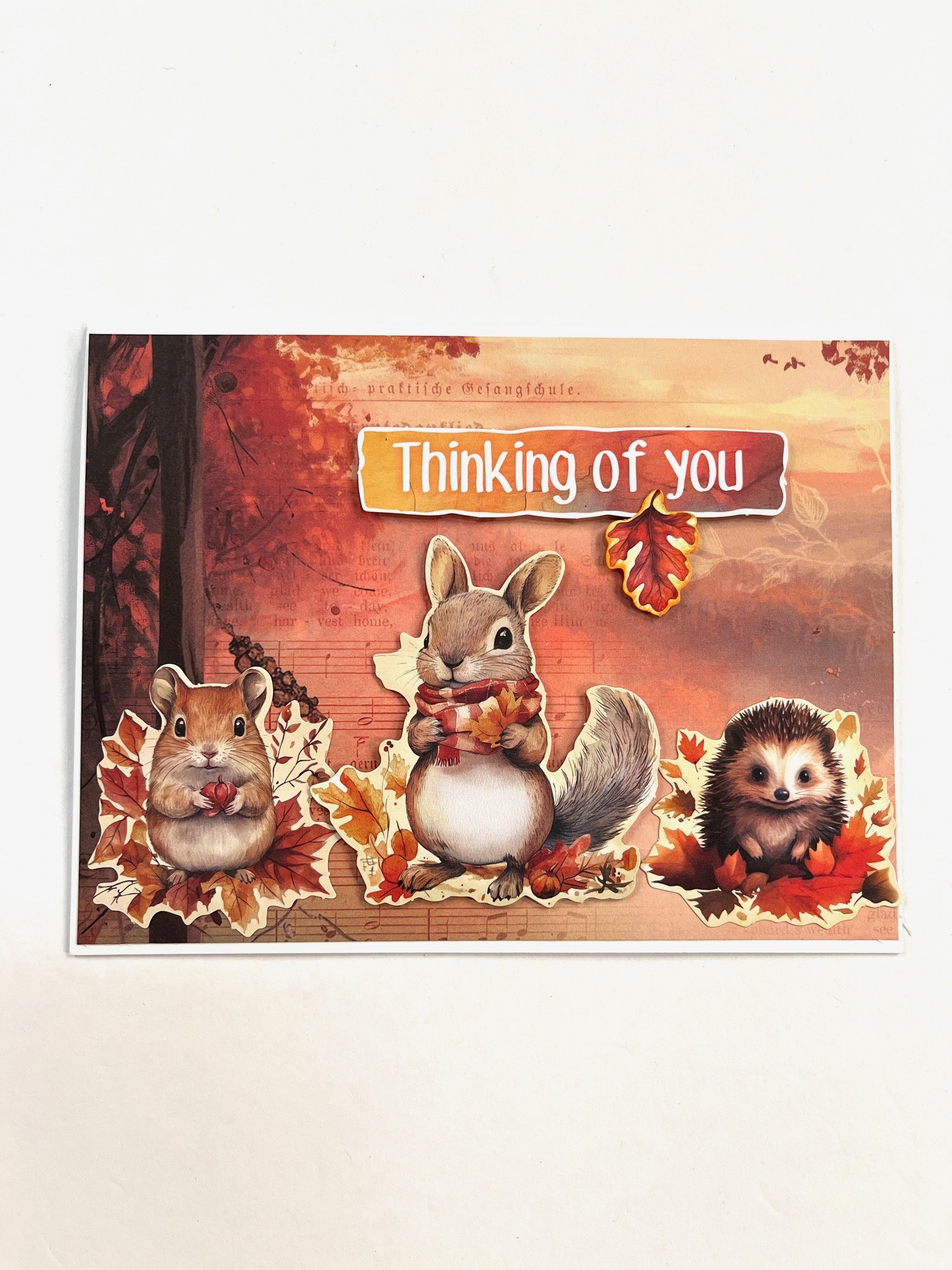 3. Foam tape “Thinking of you” die-cut ¾” from the card fold. Foam tape the squirrel in the center and glue the mouse and hedgehog on each side. Foam tape the leaf as shown.