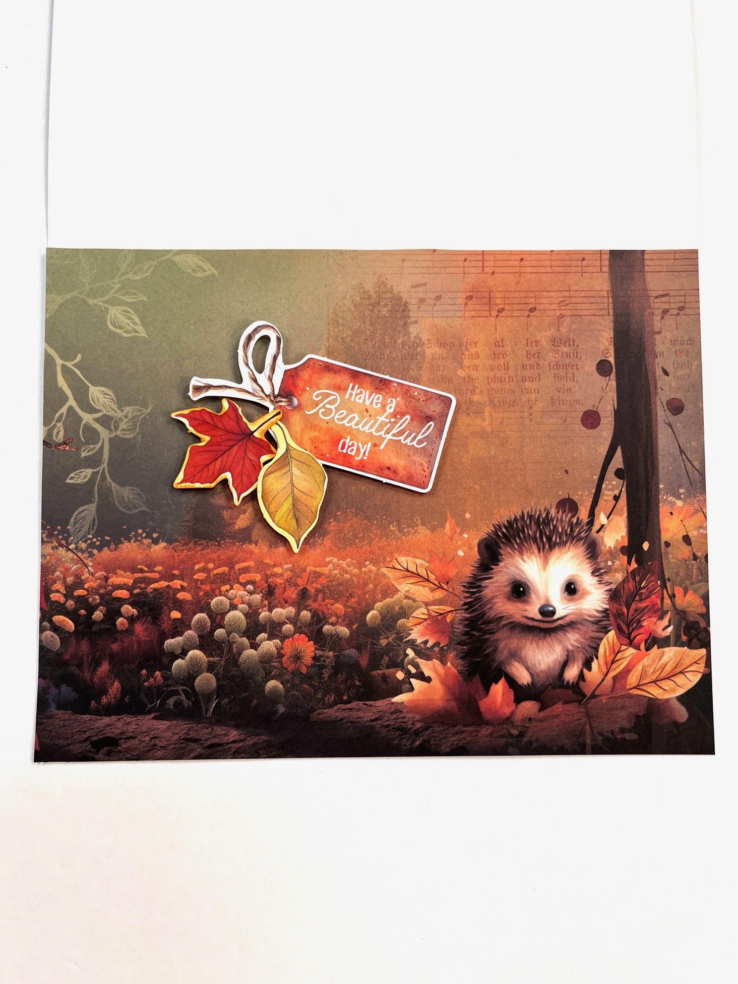 4. Inside: Cover the inside with the bottom of the Charming Autumn paper keeping the hedgehog on the left. Color an orange leaf with roasted pumpkin and a yellow leaf with warm honey. Foam tape “Have a beautiful day” die-cut in the center and foam tape the colored leaves as shown.