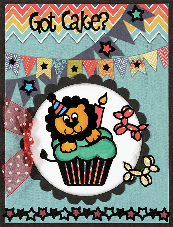 Back the cupcake wrapper on the lion Party Animal Dazzles™ with Happy Days chevron paper. Glue to the circle die-cut as shown. Color the frosting with BT4 and hat stripe BT7 Turquoises Spectrum Noir™ pens. Color lion and candle flame with GB5 and CT4 Yellows Spectrum Noir pens. Color party hat and candle CR11 Reds. Glue the scalloped circle 5/8” from the card bottom.