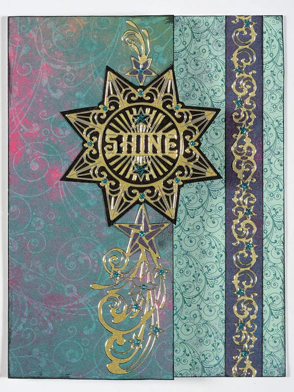 Place the card with the fold on the left. Cut 2” from the right edge of the card front only. Cover the card front with Fancy Feathers blue swirl paper and ink the edges. Place the large star frame Dazzles™ on black cardstock with the “Shine” circle in the center. Cut out around the star frame, leaving a 1/16” border. Glue to the card edge, 1” from the top.