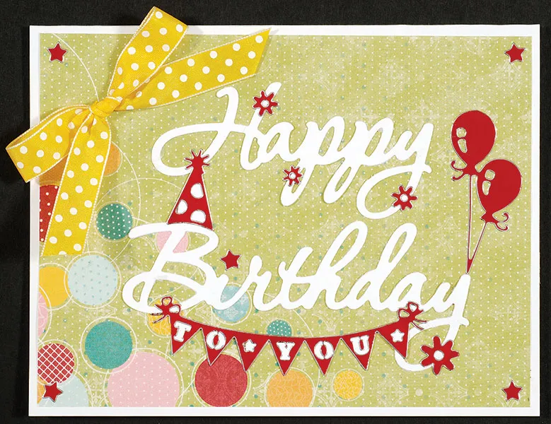 Embellish the die cuts with red flower Birthday Dazzles™. Use 1/2” wide yellow dot ribbon to make a bow and Zot™ to the top left corner of the card.