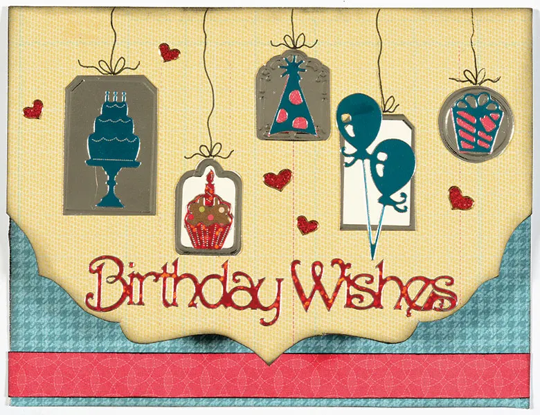 Glue 5 silver tag shapes evenly spaced and staggered across the card front. Draw wiggly lines and bows on each tag. Place a red cupcake Dazzles™ backed with brown dot paper on one tag, and a blue cake, blue balloons, a hat and a gift backed with red tile paper on the remaining tags. Place small red heart Dazzles™ among the tags.