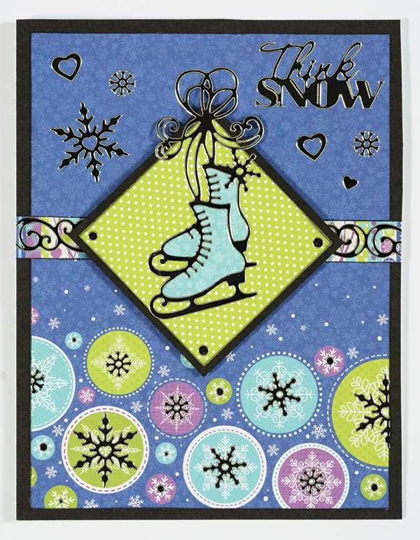 Place the card fold on the left and cover with black cardstock. Cut Winter Wishes Artful Card Kit blue border paper to 4 3/4”x6 1/4&rdquo,; ink edges and glue to the card center. Place Ice Skates Dazzles™ snowflakes to the center of each snowflake circle.