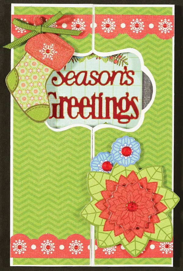 Glue and foam tape the remaining die cuts to the front flaps as shown, then place rhinestones in the flower and snowflake centers. Cut the ribbon in half and tie a shoestring bow with one piece. Glue to the stocking tab.