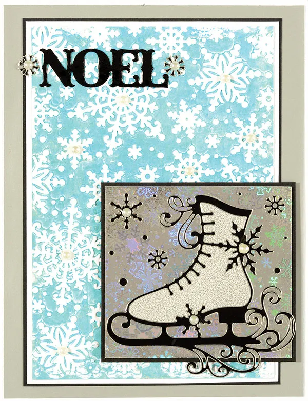 Cut 3"x2¾" Snowflakes holographic paper and mat on black cardstock with 1/16" borders. Place the 3" Dazzles™ skate on silver Pearl paper and cut around the edges of the shoe portion. Remove the pearl paper backing and place the skate on the holographic paper, then place Dazzles™ snowflakes around it. Foam tape the skate to the front at the lower right. Place pearls on the snowflakes as shown.