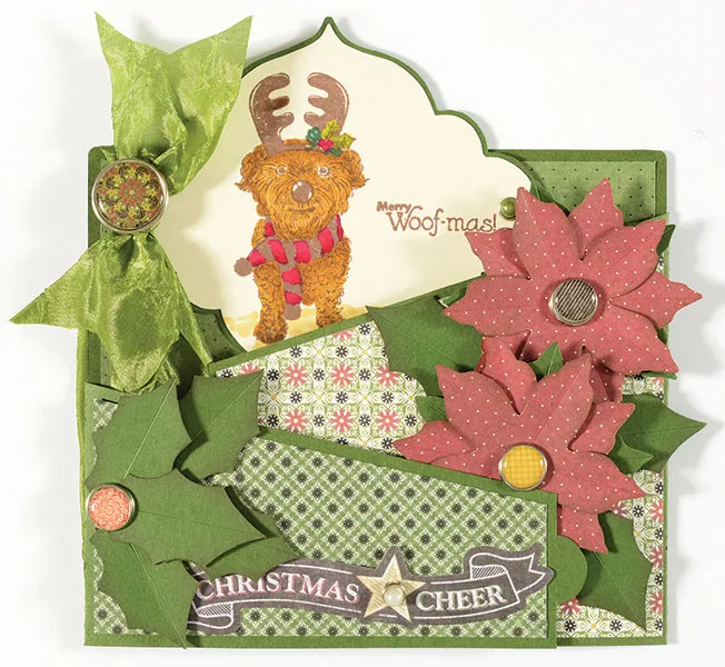 Stack two maroon poinsettias on top of one green poinsettia and insert a ½" yellow brad in the center to secure the flower. Repeat for a second flower, securing it with a black ½" brad. Trace and cut three holly leaves from green cardstock, ink the edges, and score the centers. Glue the flowers and leaves to the panel as shown.