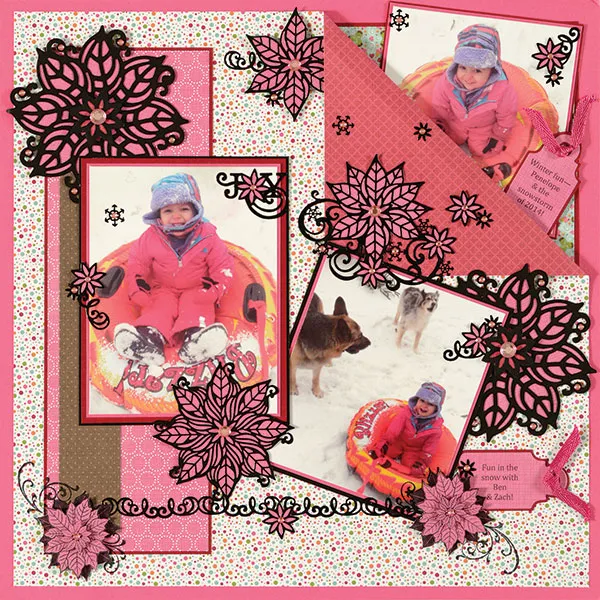 Place the remaining poinsettia Dazzles™ on Sweet Life pink mesh paper and cut along the edges. Glue and place the Dazzles™ snowflakes and flowers on the page as shown. Place rhinestones on the flowers and snowflakes.