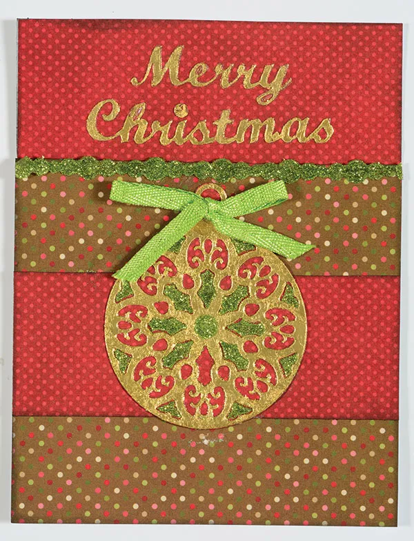 Peel the Double Stick Dazzles™ Christmas Ornament border from the backing sheet and cover one side with grass green glitter. Place along the top edge of the card front. Place the large Double Stick Dazzles™ round ornament on Christmas Sweets red dot paper and place gold metal leaf over the sticky front of the ornament. Use a cosmetic sponge to gently buff away the excess metal leaf. Cut out the ornament close to the Dazzles™ edge and glue to the card front as shown.