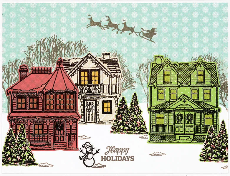 Stamp “Happy Holidays” at the lower front, then glue the snowman just left of it. Stamp Santa's sleigh in the sky as shown. Use the clear Wink of Stella marker to color the snowman, evergreen trees, all the snow on the houses, and the small snowdrifts. Color all the windows with the gold marker.