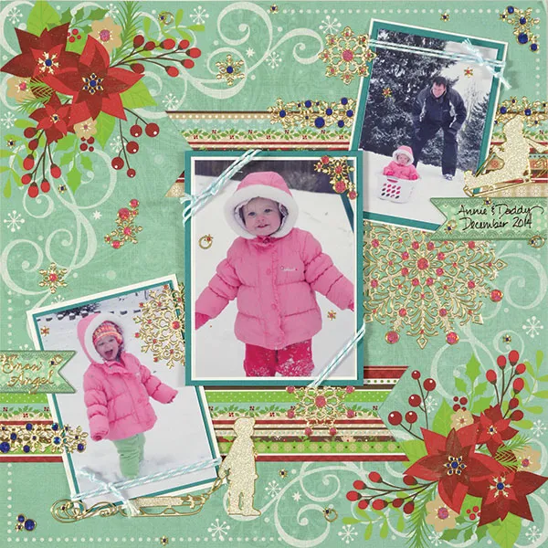 For the page: Brush the Wink of Stella marker over the red flowers on a Winter’s Garden corner design paper and let dry. Cut 8 3/8"x1 7/8" and 9"x2" Winter’s Garden striped papers. Cut an inverted “V” in one end of each to create banners.