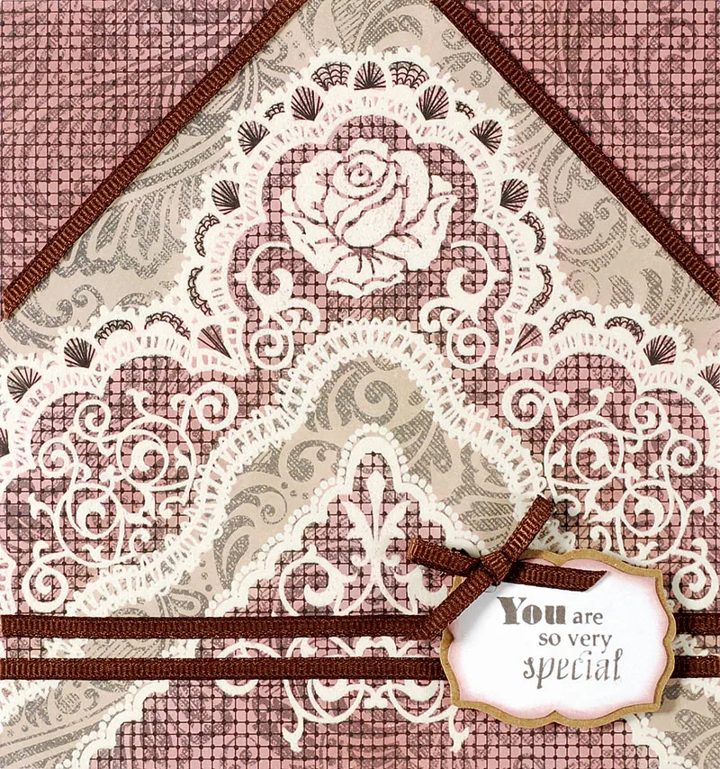 On the large triangle, use a cosmetic sponge to color the outer border with Pumice Stone Distress ink. Color over the Pumice Stone layer with Spun Sugar. Color the roses lace border with Victorian Velvet. Color the next border with Pumice Stone and Spun Sugar, and color the bottom triangle with Victorian Velvet.