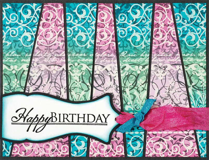 Cut out the long curvy label from the Tags and Borders sheet. Trace it onto white cardstock and cut out. Cut the label into two pieces, with the right piece 3 3/4” long and the left piece 2 1/4” long. Ink the edges of each piece with Deep Lagoon. Stamp and emboss “Happy Birthday” on the long piece and “For Someone Special” on the shorter piece. Mat each piece on black cardstock, leaving a 1/16” border. Punch a 1/8” hole in the pointy tip of each piece. Thread 6 1/2” of pink crepe ribbon through the hole in the long piece. Fold the short end of the ribbon onto itself, then tie a 3” piece of metallic teal ribbon around the folded pink ribbon. Foam tape the greeting in the bottom left, 1/2” from the bottom. Wrap the long end of the pink ribbon around to the back of the black carstock and use Zips™ adhesive lines to attach. Add a Zot™ underneath the knot of teal metallic ribbon. Glue the entire black cardstock piece to the front of the card, with the fold on the top.