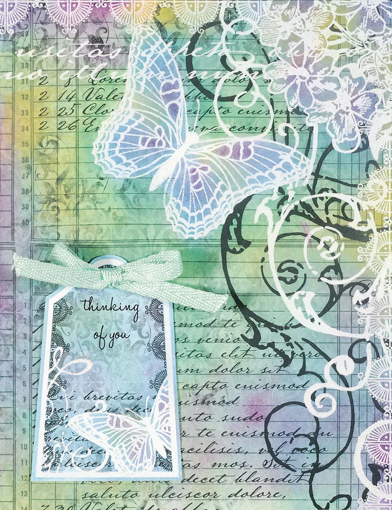Cut out the butterfly tag leaving a 1/16” border around the edges. Apply French blue ink to the tag including the border. Add a bit of Warm Violet to the butterfly and background of the tag, then repeat with the Ice Jade. Wipe off the excess. Write or computer print “thinking of you” on the top of the tag. Glue tag to the lower left side of the card front. Tie an aqua metallic ribbon bow and Zot™ to the top of the tag.
