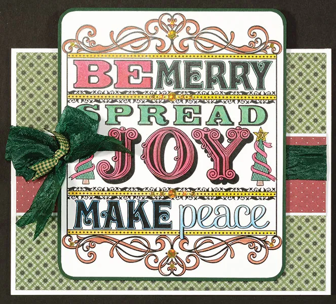 Cut out “it’s the most wonderful time of year” and “wishing you the special gifts…” from the Christmas Cheer sayings paper. Mat each on white cardstock with 1/16" borders, then on green cardstock with 1/8" borders. Glue “it’s the most…” sentiment to the upper left as shown.