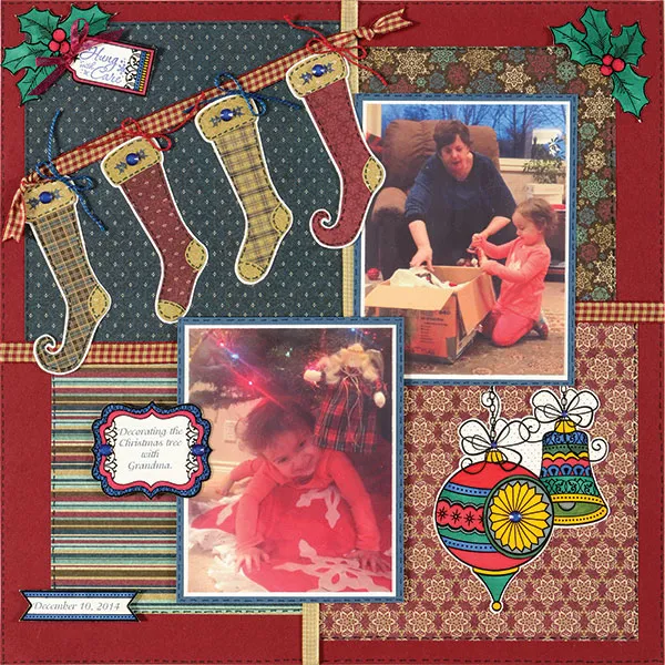 Tie two shoestring bows from each embroidery thread and glue to the stockings as shown. Computer journal on a 2¼"x1¾" Colorist label and on a Colorist banner label. Color the frames with alcohol pens, then foam tape to the page as shown. Place rhinestones on the label, ornament, and stockings as shown.