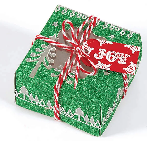 Make a tag with the template using red cardstock. Stamp “JOY” and some snowflakes around the tag with Versamark. Sprinkle on white embossing powder and emboss with a heat tool. Wrap red and white baker’s twine twice around the box, twist the ends, and wrap twice around the opposite sides. Tie a knot at the top, string the tag through one end and tie another knot. Tie a bow to finish.