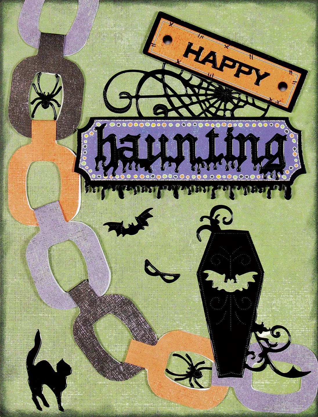 Place the spider web swirl 3/4” from the top and right. Punch out a large blank purple label and a smaller orange label and trim or sand off the nibs. Place “Happy” on the orange piece and foam tape it tilted to the top right as shown. Place “haunting” on the larger purple label and foam tape below the spider web as shown. Trim off a piece of the drips border to fit the label and place along the bottom of the label. Place the coffin, spiders, bat, eyes, and cat on card as shown.