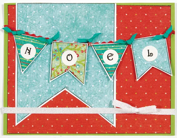 Foam tape the banners evenly spaced across the rick rack. Computer journal “noel” (Harrington font-26 pt) and print onto white cardstock. Punch out the letters with the circle punch and glue to the banners. Glue knotted lengths of green ribbon between the banners. Tie a bow within a 12” length of white ribbon and glue across the bottom of the card, 3/4” from the bottom edge of the card.