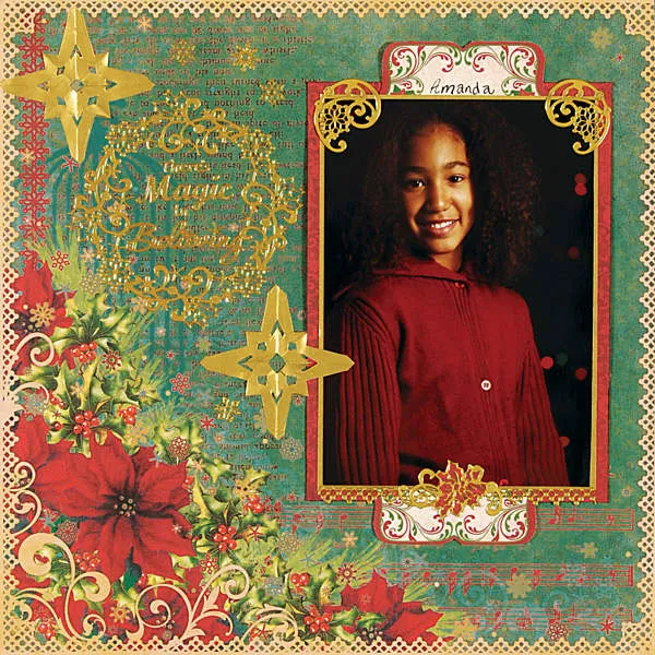 Adhere corner Dazzles™ at the top corners and a length of Dazzles™ border along the bottom edge of the photo. Back a small poinsettia sticker with red swirl paper and glue to the center of the photo bottom edge.