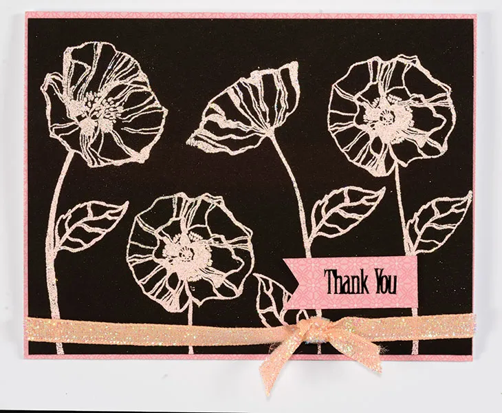 Card inside: Cut a 4¾”x4¾” black cardstock. Stamp a #2 pink circle flower stamp on the right side in VersaMark™ Ink. Heat emboss with pink embossing powder.