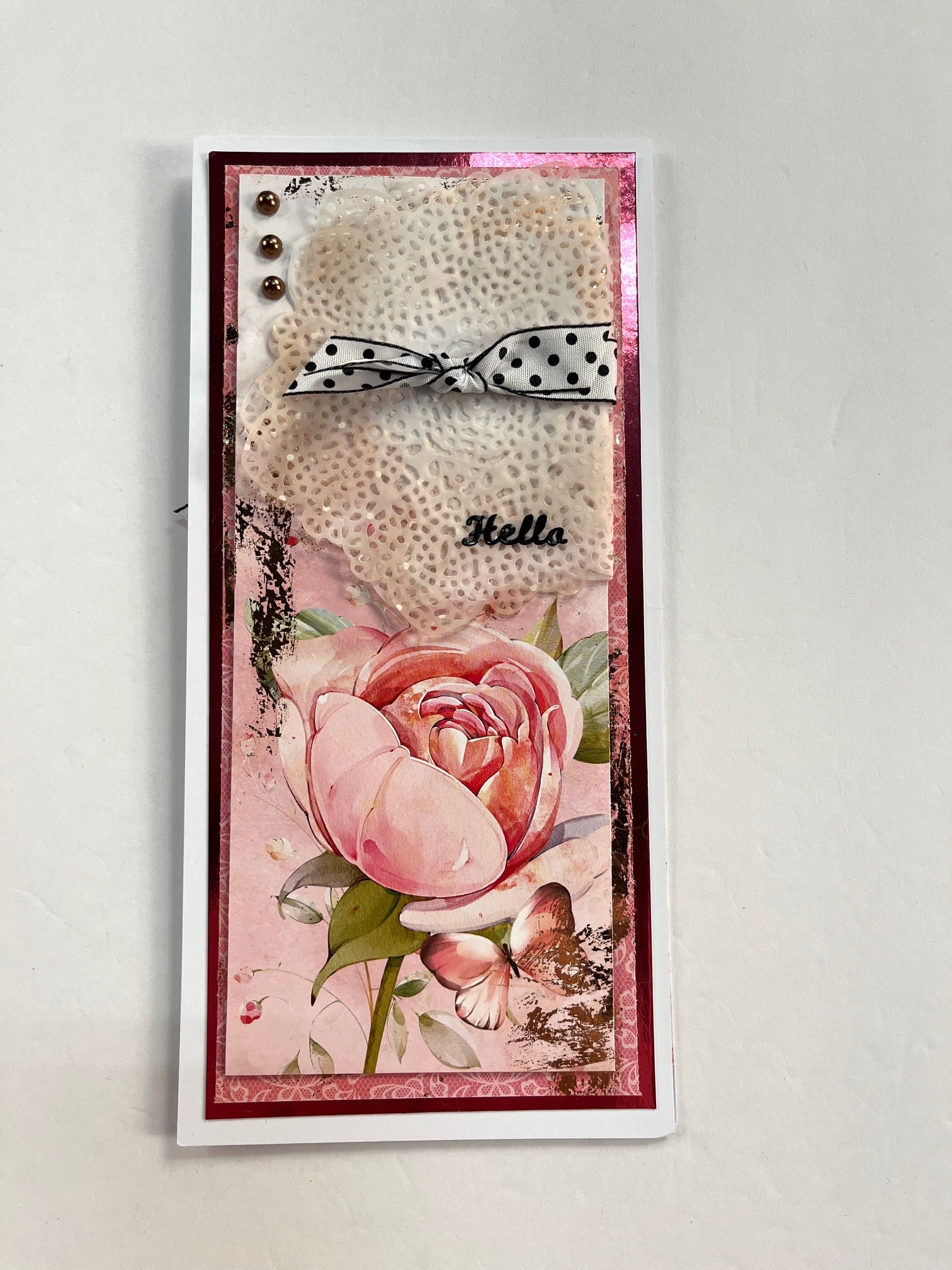 Cut 3”x7 1/4” rose paper (it’s on the other side of the lace paper) and add foil to it as well—keeping the foil on the edges. Die-cut two vellum doilies from the Luscious Lace die set and go over the edges with the Velvet Fawn ink pad using a craft mat and blender brush. Stack the doilies and tape the center of the bottom one to the card with 1/4” of the lace doily attached to the back of the paper. Wrap 2” of white ribbon over right side in the center of the doily. Make and Zot™️ a 2” knotted ribbon over top leaving left side clear. Foam tape the paper to the card. Place Pearls and “Hello” Dazzles™️ as shown.
