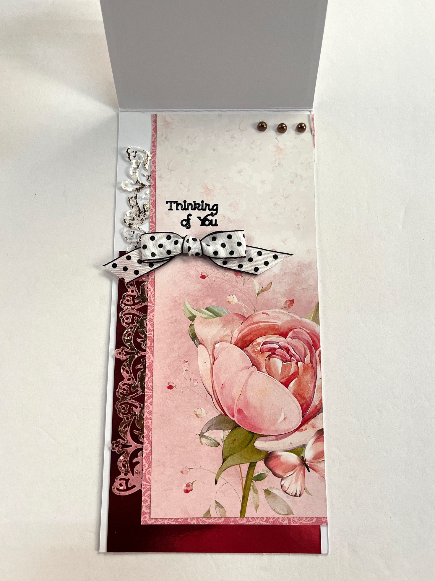 3 1/8”x7 7/8” pink lace paper and tape along the right side. Cut 3”x 7/1/2” rose paper and tape flush to right side. Place pearls at the top as shown. Make and Zot™️ a 2” dotted bow from the White Ribbon Set and place on the left side of the rose paper 5 1/4” from bottom. Place “Thinking of You” Dazzles™️ on top of the bow.