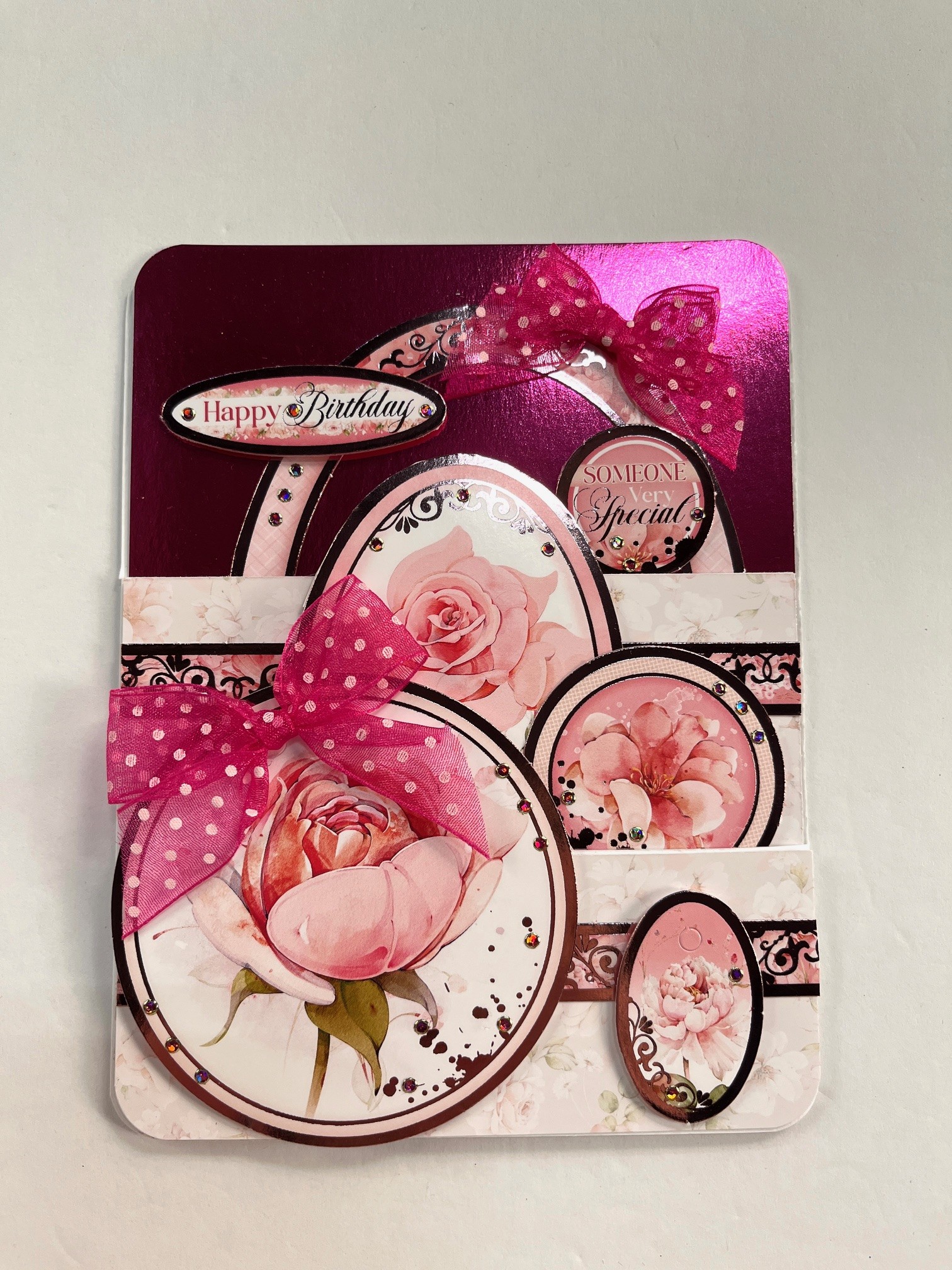 Front Panel: Cut 5”x4” lightly patterned Adorable Scoreable and attach to the front panel. Tape pink border die-cut 1/2” from the top. Tape pink dotted Adorable Scoreable onto the back of the single rose oval Topper and trim to fit. Tape to the center of the card front. Place the round Topper on the right. Place pink jewel Dazzles™️ as shown.