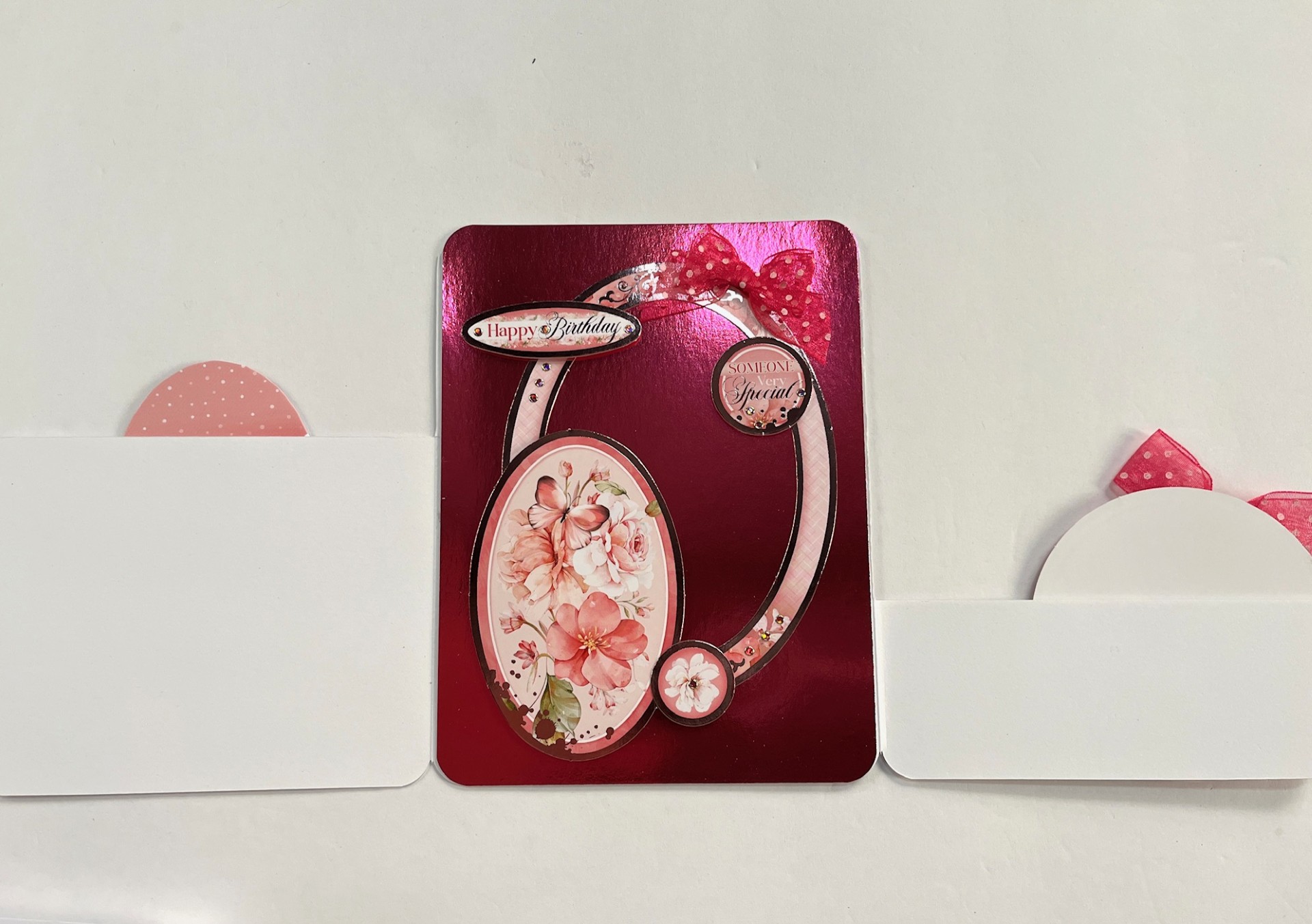 Right Inside Panel: Cut 5”x2” piece of lightly patterned Adorable Scoreable and corner punch the bottom corners then tape to the right inside panel. Tape pink border die-cut 1/2” from top. Remove center of circular rose Topper and tape to left side. Make and Zot™️ a 2 1/2” wide bow from the Magenta/Dark Pink Ribbon Set and place on top. Tape the small oval Topper 1/2” from the right. Place pink Dazzles™️ as shown.
