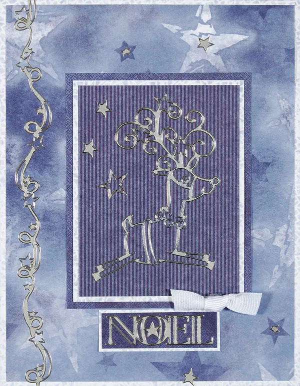 Attach “NOEL” to blue weave paper, trim and mat with blue swirls paper. Attach below the reindeer focal. Attach Star Dazzles™ around the focal and on the stars paper. Add the Dazzles™ border to the left of the card, as shown. Zot a ribbon knot the lower right of the focal.