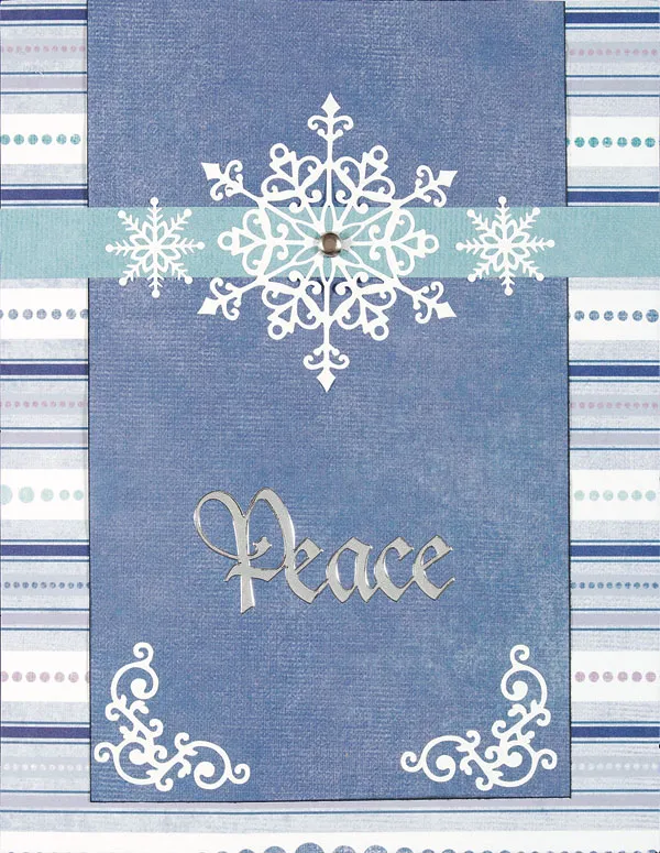 Add three Snowflake Dazzles™ to the light blue strip, and a brad to the center of the large one. Add corner Dazzles™ to the bottom of the blue mat. Use the transfer sheet to add the greeting, as shown.