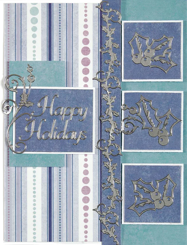 Inside the card: Cut three 1 1/2” squares of blue paper and mat with white. Place Holly Dazzles™ in the center of each.