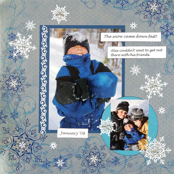 Adhere small white Dazzle™ snowflakes to the center of the snowflakes on the background paper. Adhere the larger Dazzles™ overlapping the circle photo mat, below the journaling and to the left of the large photo. Secure silver snowflake brads to the center of the large snowflakes using a knife to cut small slits.